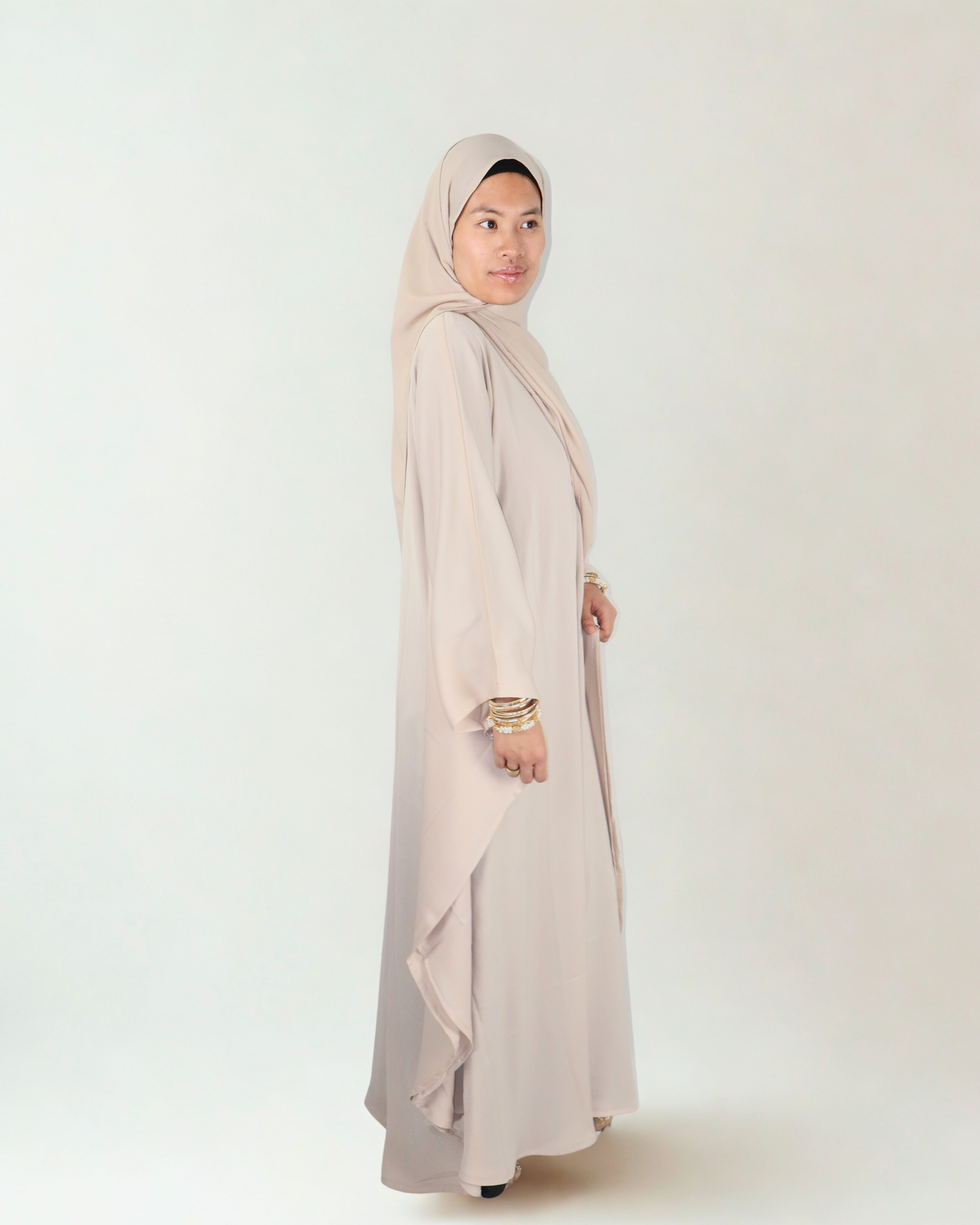 the vanilla butterfly kaftan & matching hijab set is crafted from premium fabric with a smooth, graceful drape that moves effortlessly. the warm sand tone feels timeless and elegant, making it perfect for eid, jummah, nikkah, special gatherings, and refined evenings. minimal in design yet rich in presence, this luxury piece is designed to be worn with quiet confidence.